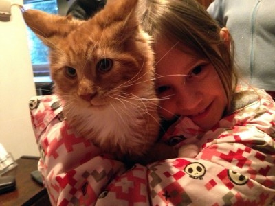 To pierwsze zdjęcie Mańka z nami, a właściwie z Majką, zrobione w sobotnie popołudnie 10 lutego 2013 w Baiłymstoku. Był mróz, jak to w lutym w Białymstoku a Maniek był zaspany, cieplutki i trochę przestrasznony kiedy pani Jolanta, właścicielka hodowli maine coonów przyniosła nam go z pięterka swojego domu, które od reszty świata odgrodzone zostało specjalną siatką zabezpieczjącą żeby się maine coony nie rozpełzły. Ale i tak były wszędzie. Jeden siedział na parapecie i wyglądał jak wypchany. Drugi - przy okapie w kuchni, trzeci na desce do krojenia chleba. Wszystkie emanowały dostojnym spokojem z wyjątkiem tatusia Mańka - wielkiej urody srebrzystego Monte Moona, który na widok każdego człowieka usiłował zamienić się w kulkę kurzu i z prędkością ponaddźwiękową wytoczyć się z pola widzenia. Odważny to on nie jest. Co innego Maniek. Mały od razu przytulił się do Majki i bez jednego miauknięcia dał się wynieść do samochodu. Umościł się na kolanach i ruszyliśmy. Jeszcze wtedy nie wiedzieliśmy, że maiuczeć to on nie umie a spokojnie będzie tylko do Wyszkowa