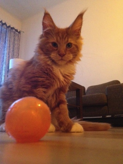 Maniek z piłeczką. To jedna z tych zabawek, które w ogóle nie interesują Mańka ale dobrze się z nimi wygląda na zdjęciu. Jeśli zaś chodzi o zabawki, od kiedy M odkrył zasłonę z frędzli w przedpokoju piłeczka nie ma szans.