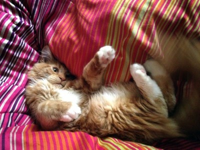 Maniek ma dopiero trzy i pół miesiąca. Urodził się 26 października 2012, to jeszcze dziecko. Pani Jolanta na drogę wyposażyła go więc w jego ulubioną zabawkę - piłeczkę z którą się dotąd nie rozstawał i kocyk, żeby jego zapach uspokajał go i przypominał mu dom. I tak gdzieś koło Wyszkowa Maniek zakręcił się niespokojnie, zeskoczył z kolan Majki i schował się w kontenerku. Po chwili samochód wypełnił przerażający zapach a Maniek z miną zagadkową stanął przy samym wejściu do kontenerka jakby w jego głębi czaiło się coś strasznego. Tak było w istocie. W samym środku Pierwszej Kupy Mańka, na kocyku, leżała jego ukochana piłeczka. I to tyle o piłeczce. Maniek jak każde dziecko dużo śpi. Najchętniej w naszym łóżku i w dziwnej pozycji. Maine coony tak mają.