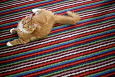 Dywan nie jest duży i przeważnie rządzi na nim Tygrys. Ale Mańkowi też czasem udaje się na chwilę położyć. Z sobie tylko znanych powodów woli układać się wzdłuż pasków. Całkiem jak mój kolega. który siadając do brydża najpierw biegł do łazienki sprawdzić jak stoi wanna. Żeby broń boże nie usiąść w poprzek bo to miało mu przynosić pecha. Może Maniek też jest przesądny? Bo chyba nie zamierza zacząć grać w brydża - w końcu jest ich z Tygrysem tylko dwóch