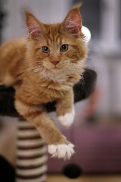 Jeden z mańkowych zwisów. Maine coony słyną z tego, że są bardzo elastyczne. Pisałam o tym już wiele razy ale właściwie nie da się tego opisać - po prostu trzeba wziąć takiego kota na ręce i przekonać się samemu. To trochę tak jakby Maniek nie wiedział, gdzie się kończy i co robią jego łapy i ogon, jakby każda z tych części Mańka miała inny pomysł na spędzanie wolnego czasu. Tak naprawdę to oczywiście złudzenie - Maniek jest kotem i koordynację ma bez zarzutu. Nawet gdy spada z drapaka