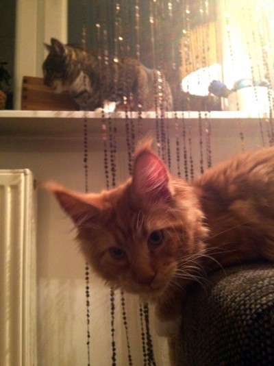 Lepiej, kiedy są w bezpiecznej odległości od siebie zwłaszcza jeśli w pobliżu są firanki. Chłopaki lubią się bić - okładają się łapami, bez pazurków ale dość mocno. Zwykle zaczyna Maniek i obrywa od Tygrysa. Na szczeście nie nauczył się jeszcze wskakiwać na parapet. Niestety już wie jak fajną zabawką są frędzle