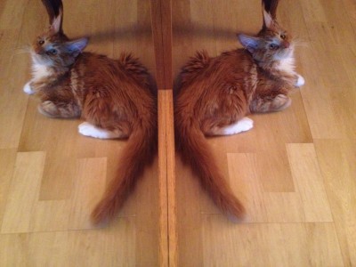 O tym, że Maniek lubi oglądać się w lustrze już pisaliśmy. Rzecz jasna - nie tą stroną. Miejsce obok szafy z lustrem jest fajne również dlatego, że na szafie przeważnie siedzi Tygrys. A Maniek nie traci nadziei, że w końcu się zaprzyjaźnią. My też nie tracimy