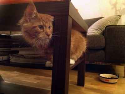 Maniek waży dopiero 2,4 kg. To nieźle jak na niespełna czteromiesięcznego maine coona ale naprawdę malutko w porównianiu do kolegi Tygrysa. Kolega Tygrys w wyniku nocnego dożywiania dojechał już do 7,6 kg i wszyscy zastanawiają się czy na tym poprzestanie. Byłoby to wskazane ze względu przede wszystkim na jego zdrowie oraz na bezpieczeństwo nasze i naszych mebli. Na tę półeczkę zrobionego z dykty i papieru stolika z IKEI Maniek wskakuje bez problemu i nie powodując szkód. A Tygrys? Hmm... na szczęście się tu nie mieści.