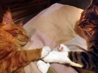 Zamarliśmy gdy zobaczyliśmy ten obrazek. Maniek udawał, że śpi a tak naprawdę zbilżał się do Tygrysa centymetr po centymetrze aż dotknął jego łapki. Bo to ciągle dzieciak i chce się przytulić. My mu nie wystarczamy. Jesteśmy za duzi, zbyt dziwnie pachnący i za mało włochaci. Finał tej sceny nie był już tak wzruszający. Tygrys się obudził, prychnął, pacnął Mańka łapą i zwiał. To jeszcze nie był ten moment
