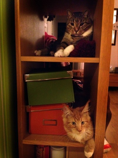 Chłopaki uwielbiają zabawę w Pawła i Gawła. Jak w tym wierszu Fredry. Na zdjęciu siedzą grzecznie ale to najczęściej traw tylko chwilę. Maniek nie wytrzymuje i zahacza łapą Tygrysa, który nie pozostaje dłużny i tak się biją między piętrami dopóki któryś nie zwali się z półki