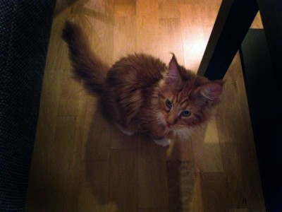 Kłopot z Mańkiem ujawnił się już następnego dnia po przyjeździe. Jak widać Maniek jest malutki, a futerko ma gęste i długie. W to futerko zaplątują się różne rzeczy i różne się do niego przyklejają. Na przykład kupa. Nie wiedzieliśmy co z tym fantem zrobić. Gdy Maniek cały zachwycony wybrykał z kuwety rozsypując żwirek w promieniu kilku metrów na nas padał blady strach. Rozpoczynał się morderczy wyścig z czasem. I z Mańkiem. Trzeba go było dopaść zanim właduje się na łóżko. Albo gdzieś usiądzie. Nieee, Maniek! Nieee! Pochwyconego i zdumionego z powodu całego zamieszania Mańka wsadza się pod kran i myje jak małego dzieciaczka. Kilka razy trzeba mu było niestety wyciąć trochę futerka. Ale Maniek nie wygląda na zmartwonego ani kąpielą ani strzyżeniem. Wierzymy, że w końcu nauczy się od Tygrysa jak kulturalne koty załatwiają pewne sprawy. Bo na razie sprawa trochę śmierdzi...